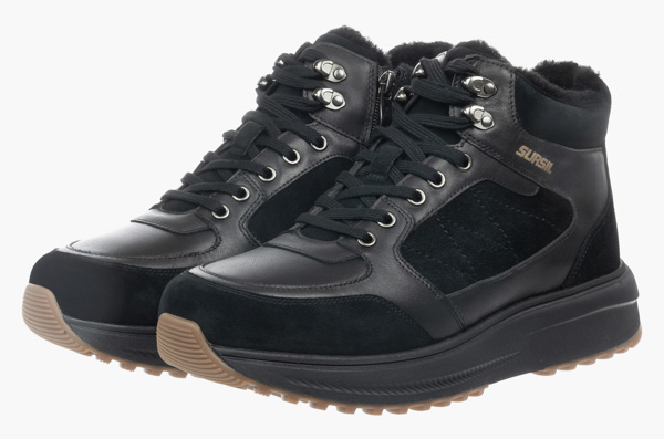 Верх из натуральной кожи черного цвета в сочетании с нубуком , дополненный черной массивной подошвой с каучуковым протектором - образец актуального стиля в сочетании с комфортом. Шерстяная подкладка и покрытие стельки обеспечат ногам тепло при минусовых температурах. Застежка на молнии с внутренней стороны в дополнение к шнуровке  значительно повышает удобство надевания. Анатомическая стелька с выраженной поддержкой сводов способствует распределению нагрузки на ноги и снижению усталости при ходьбе. Голеностоп надежно удерживается от завала плотным задником. Модель достаточно легкая, благодаря подошве из вспененного материала ЭВА, который еще и отлично амортизирует, а противоскользящий протектор обеспечивает устойчивость даже на скользких поверхностях. Подошва имеет перекатный профиль, что значительно снижает усталость при длительной ходьбе и благоприятно влияет на здоровье суставов и позвоночника.