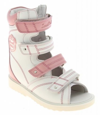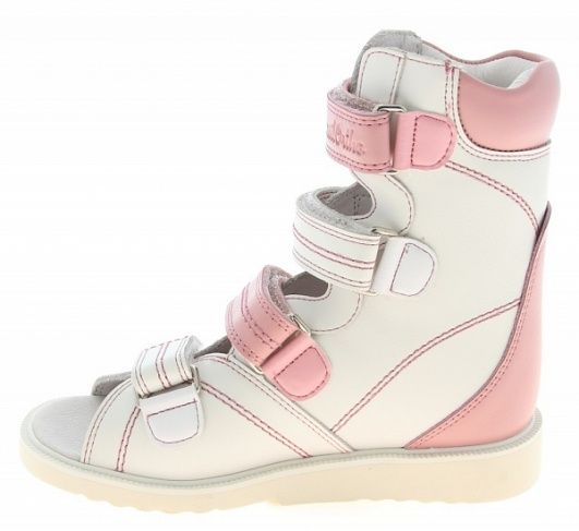 Сандалии изготавливают из нат.кожи. Обеспечивают их жесткой задней частью и берцами, которые отлично поддерживают стопы при их отклонениях. Высокий берец необходим для иммобилизации движения голеностопа. Это дает возможность суставам развиваться правильно или предотвращает развитие деформаций, эффект достигается при регулярном ношении.